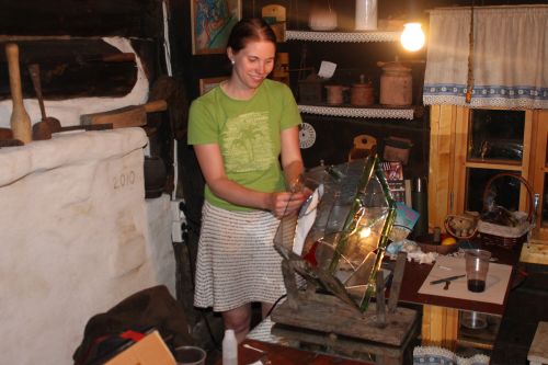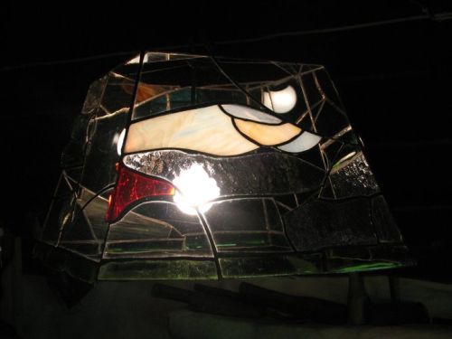 Lisaks Mardi taaskasutavale klaasile juurde siis ka natuke Kersti värvilist klaasi. Mitu päeva tööd ja nikerdamist, mida oli väga põnev jälgida ja nii see lamp lakke sai.